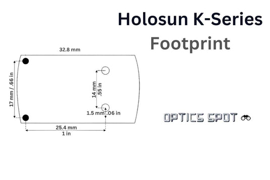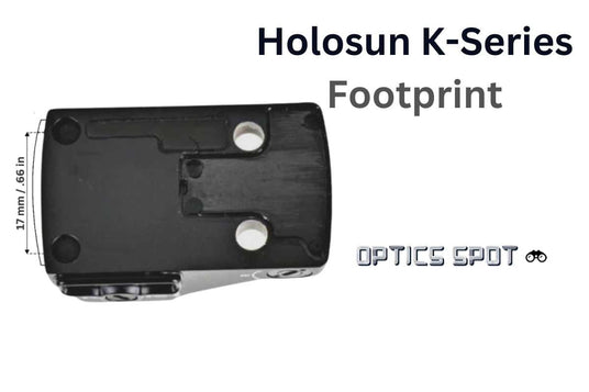 The Holosun K-series pattern consists of two sockets in the front corners of the front of the sight and of two screw holes in the rear of the sight.