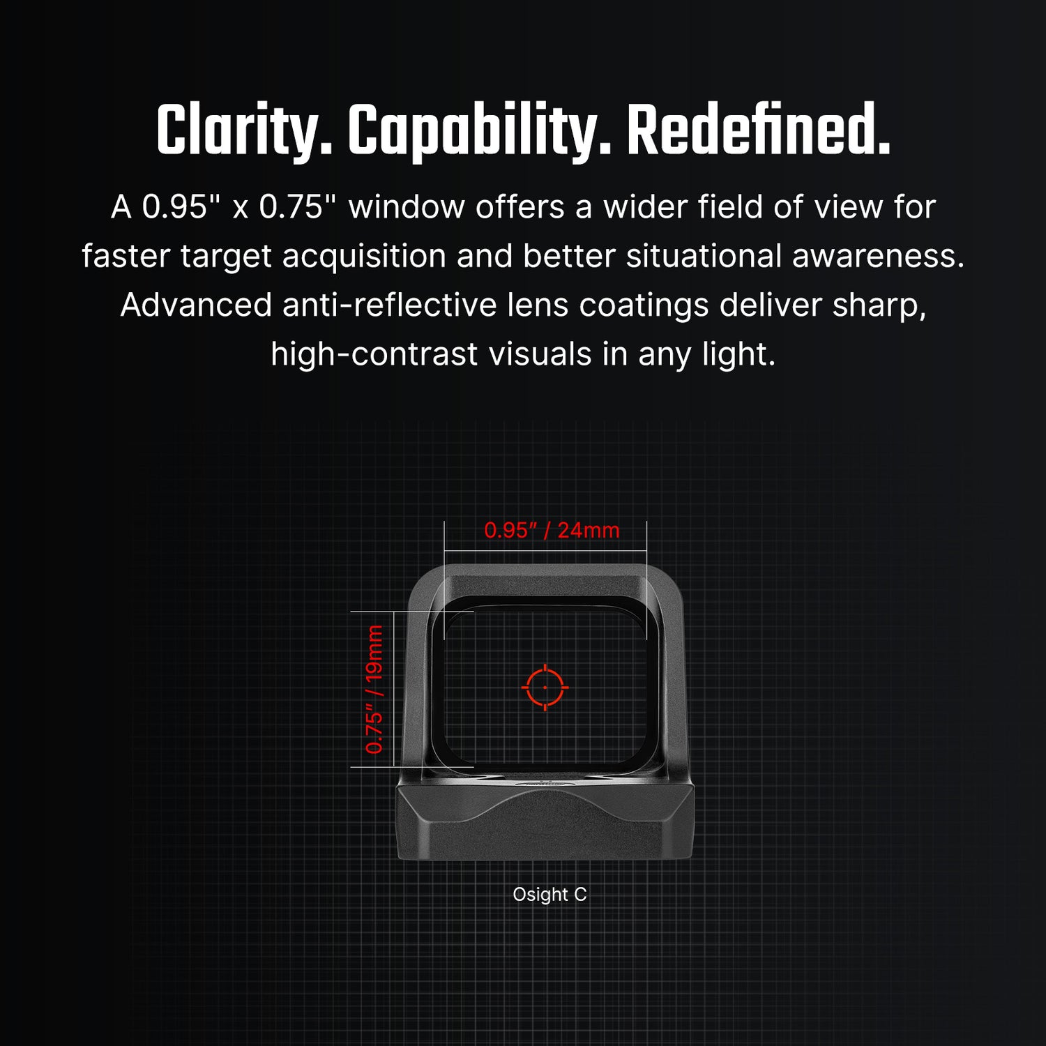 Osight C puts clarity, speed, and confidence at the center of every shot. A bright, wide viewing window accelerates your sight picture so targets pop instantly. Swap reticles to match the moment—from tight precision to fast transitions—while a smart motion sensor keeps the optic ready when you are and saves power when you’re not. Battery changes are a breeze and won’t disturb your zero. And thanks to its industry-standard footprint, Osight C drops onto a huge range of pistols and long guns without drama.